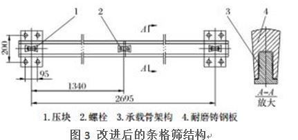 針對條格篩在生產(chǎn)中存在的問題,對格篩條進行了改進設計,改進后的條格篩主要由耐磨構件和承載骨架構件兩大部分組成,如圖3所示。